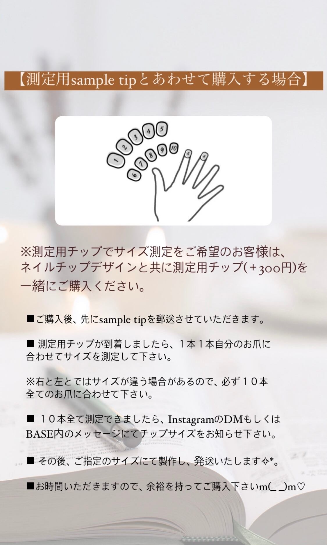 ②購入画面のご注文内容の修正から備考欄にサイズ記入をお願いします。親指から記載ください。(計測用チップをご購入の方はサイズ記入なしで結構です)