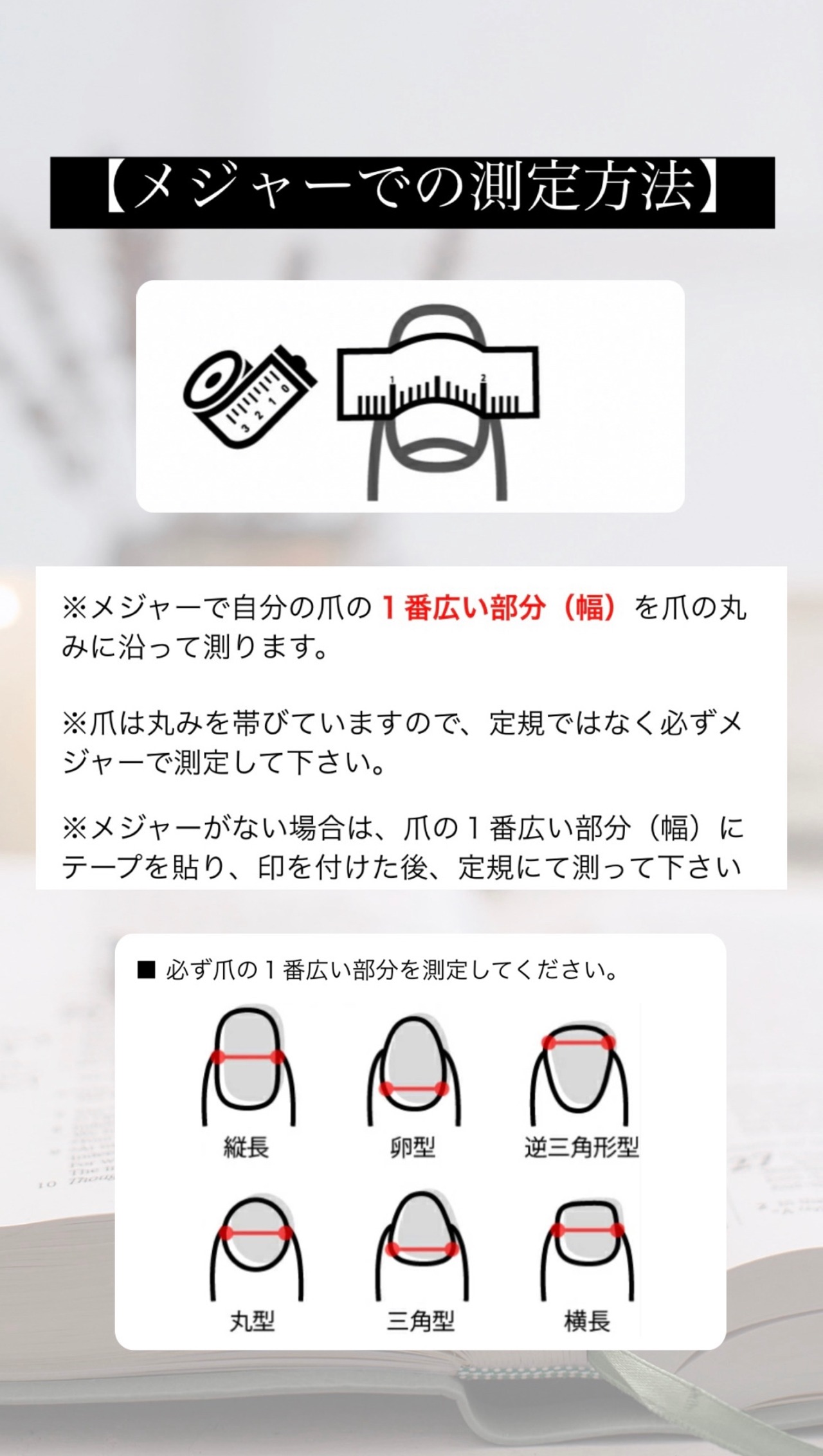 必ず柔らかいメジャーでお爪の端に0を合わせきっちりお計り下さい。